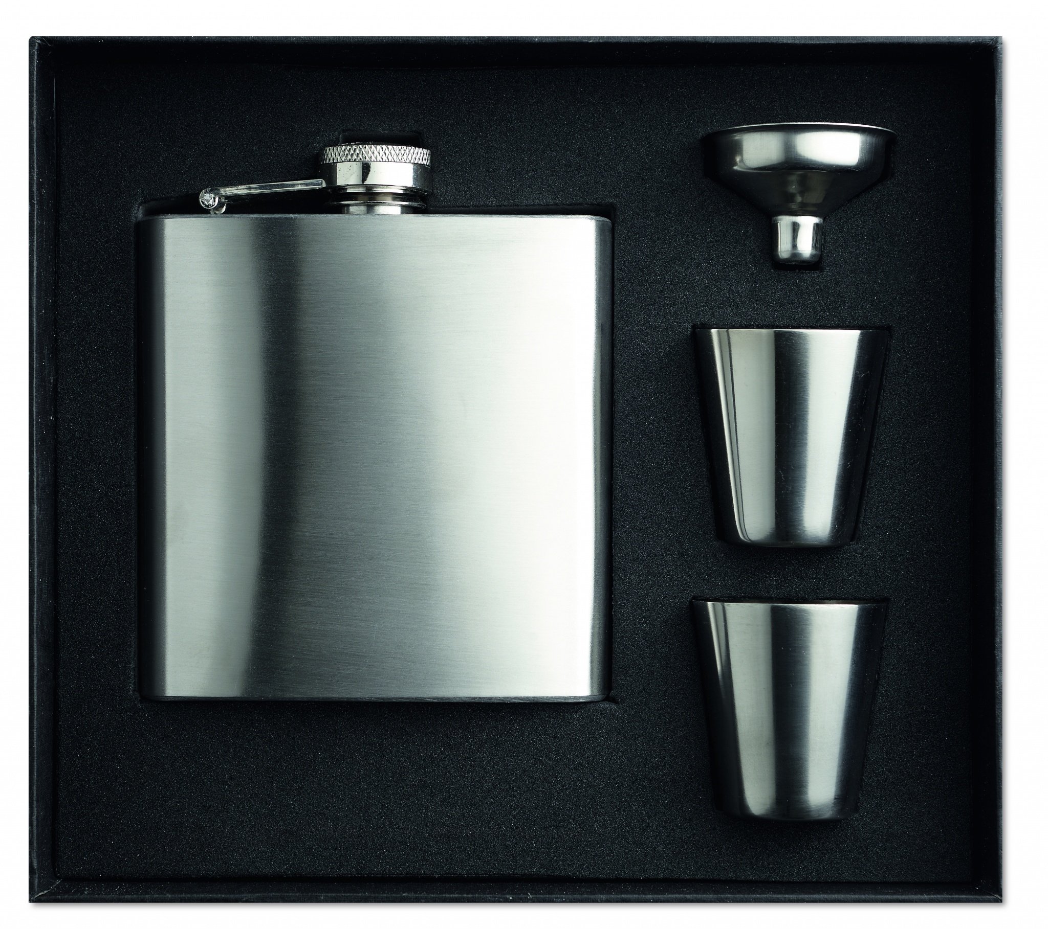 Flachmann mit 2 Trinkbechern und Trichter. Edelstahl. Füllmenge: 175 ml.