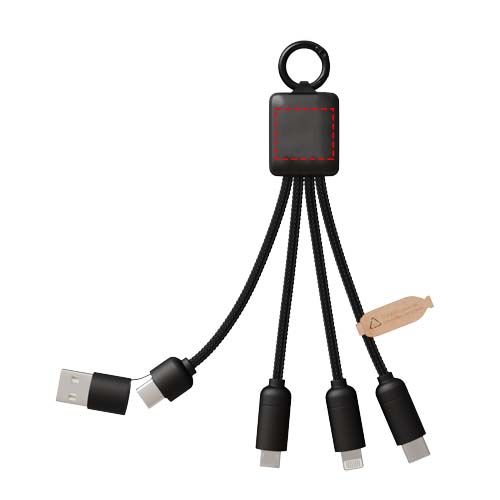 5-in-1 Ladekabel mit 3 Anschlüssen (Typ-C, Android, iPhone) und rPET-Kabeln (hergestellt aus recycelten Kunststoffflaschen). Der duale USB-A- und USB-C-Eingang macht das Kabel 100% kompatibel mit den neuesten Computermodellen (USB-C). Endkappen in Metalloptik. Das Kabel kann bis zu 3 Geräte gleichzeitig aufladen. Geliefert in einer recyclebaren Hülle und einer Karte aus recyceltem Papier.