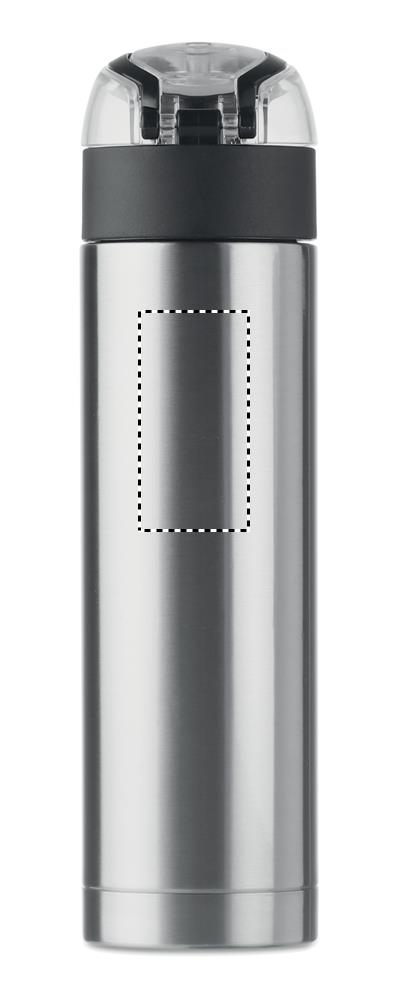 Doppelwandige Trinkflasche aus Edelstahl mit Sicherheitsverschluss im Deckel und Öffnen-durch-Drücken Funktion. Mit faltbarem Griff. Füllmenge: 400 ml. Auslaufsicher.