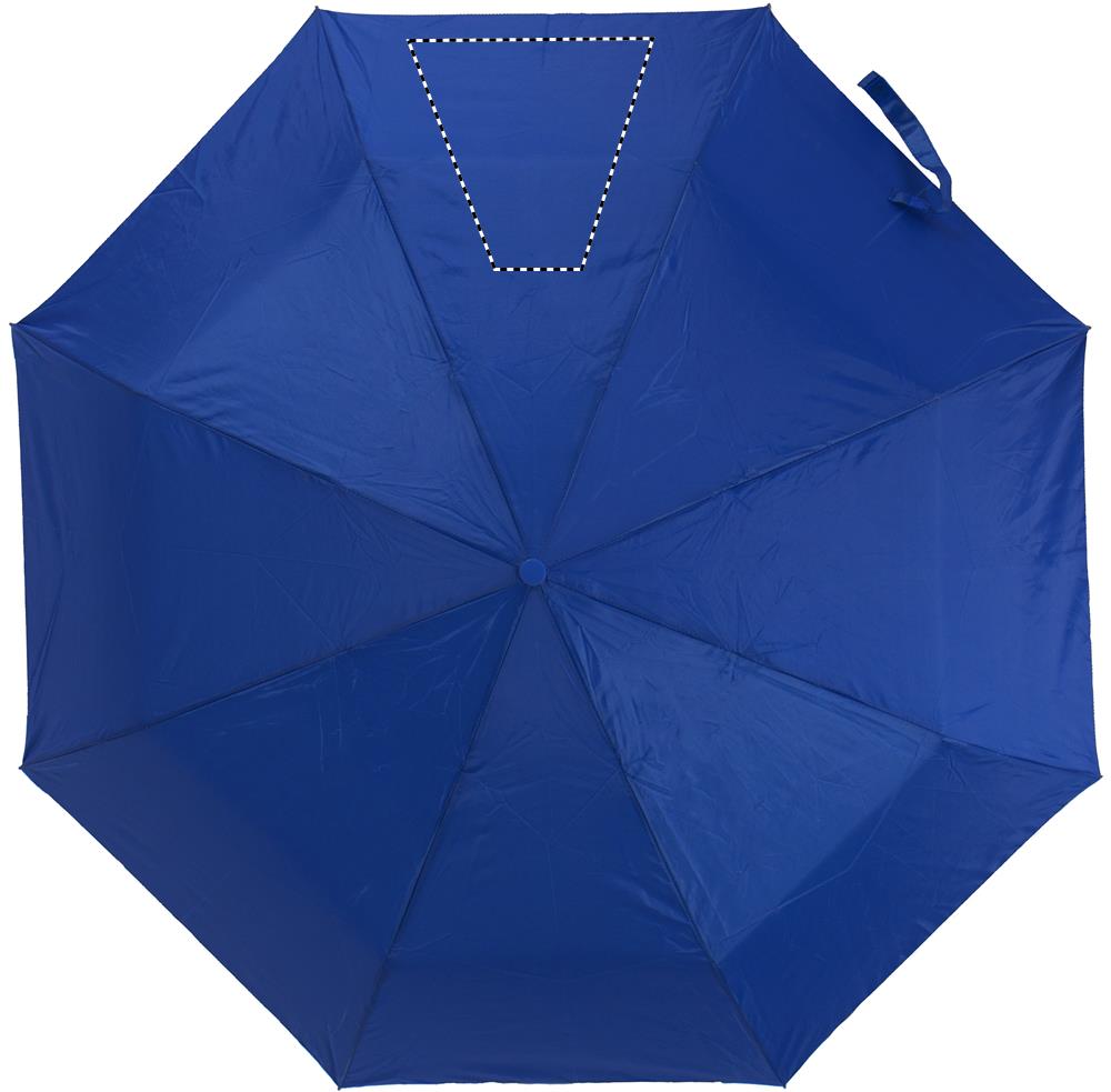 21 inch manual open umbrella in 190T polyester with zincify plating metal shaft and tips. Black plating metal ribs. Panels in colour with silver coating on back. Plastic handle in color with silver rim and black wrist strap. 3 sections fold. Includes matching pouch with silver trim. Manual closure.