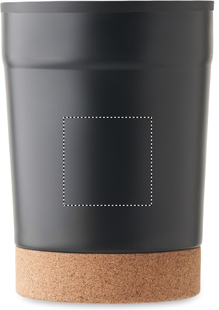 Double wall tumbler with stainless steel outer and PP liner inside, with cork base and with sliding sip hole. Leak-free. Capacity: 300 ml.