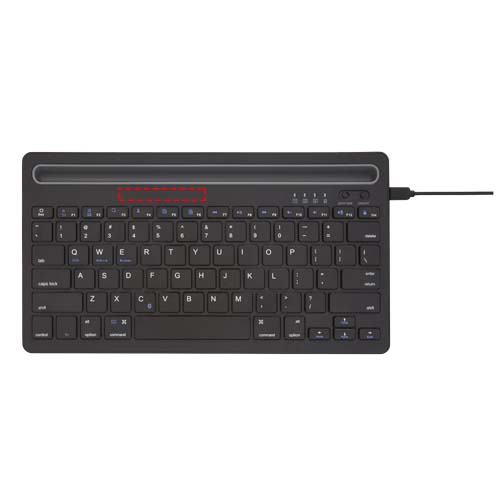 Compact QWERTY keyboard with 78 keys. Bluetooth® 3.0 with dual channel support so that it can connect with two devices simultaneously. Integrated docking stand for a phone and tablet. The keyboard is compatible with PC/laptop, tablets, mobile phones, smart TVs and other devices with Bluetooth® function. The operating distance is up to 10 meters. The 150mAh built-in rechargable battery provides at least 40 hours of usage, or up to 6 months on standby. Charging takes approximately 3 hours. Delivered in a premium kraft paper box with a colourful sticker.