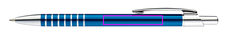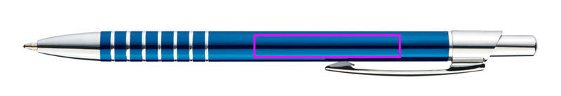 Slim metal ballpen with blue-writing refill and engraved grip zone. We engrave your logo below the clip.