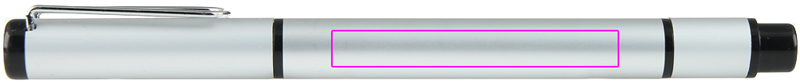 Aluminum ballpoint pen with black-writing refill and yellow highlighter on the opposite side. We engrave your logo on the shaft.