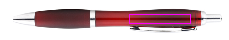 Transparent ball pen with soft touch grip zone and blue writing large capacity refill. We print your logo on the right side of the clip.