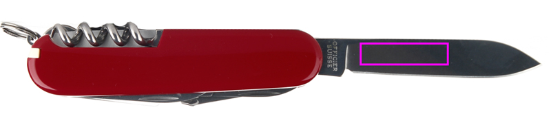 features: 1. large blade 2. nail file nail: 3 - a device for cleaning the nails 4. corkscrew 5. can opener with: 6. - small screwdriver 7. opener caps with: 8. - screwdriver 9. - wire stripper 10. skewer-awl 11. the key ring 12. tweezers 13. toothpick