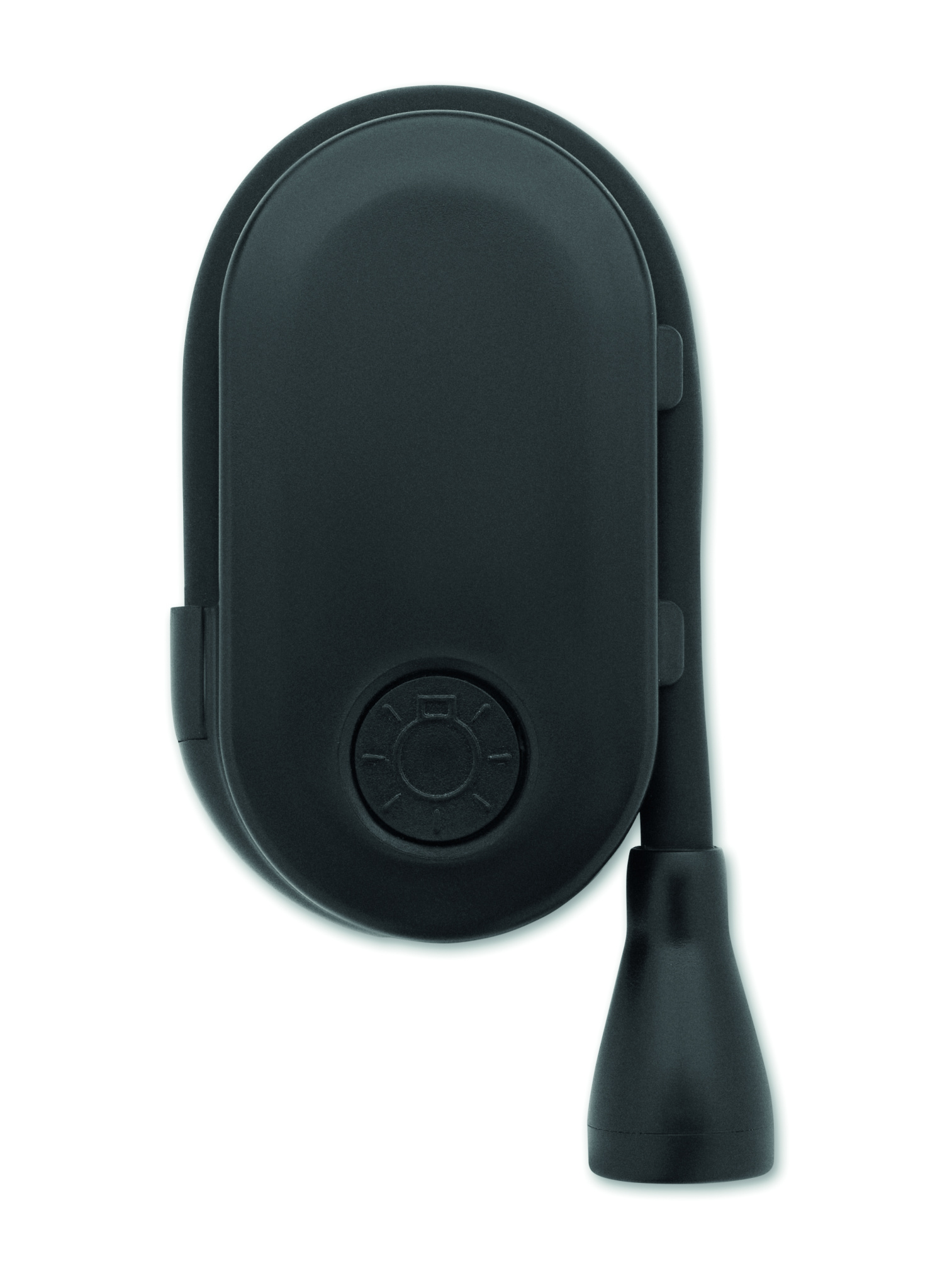 Rechargeable LED book light in ABS with flexible body and clip. Features 3 light settings, 300mAh battery.