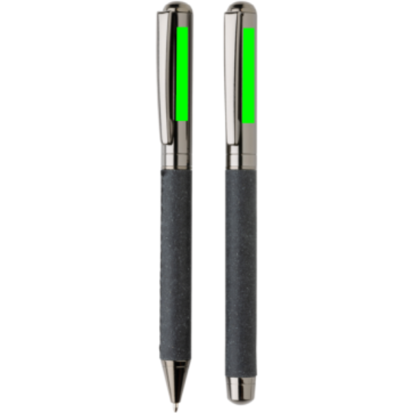 This beautiful pen set is made with recycled leather. The set has а sleek gunmetal colour design, is stylish and ideal for writing down your notes in style. It contains a ballpoint and a rollerball. Each pen includes blue coloured Dokumental ink. The writing length for the pen is 1200 metres and the roller ball is 400 metres. The pen set comes in a recycled leather pouch and a gift box with recycled leather pattern print.