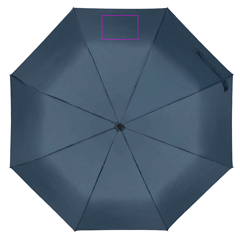 Automatic pocket umbrella with fibreglass frame, cover made of recycled PET bottles, wooden handle and wrist strap. Your logo will be printed on one segment.