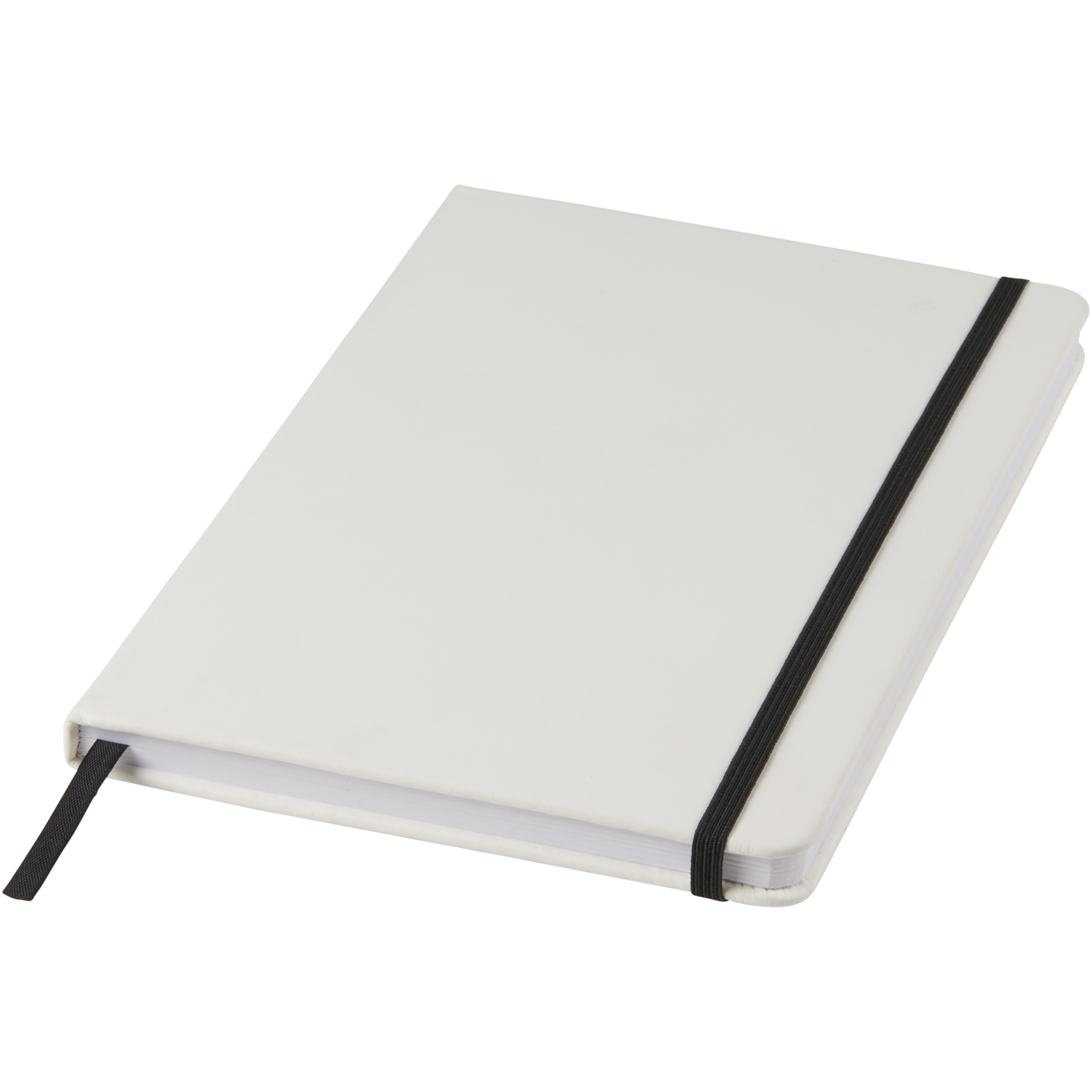 White A5 notebook with coloured elastic closure and ribbon. Includes 80 sheets (60g/m2) lined paper. Digital print possible on cover.