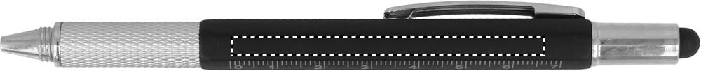 Twist action spirit level pen in ABS with ruler, stylus and phillips head and flat head screw driver bits. Black ink.
