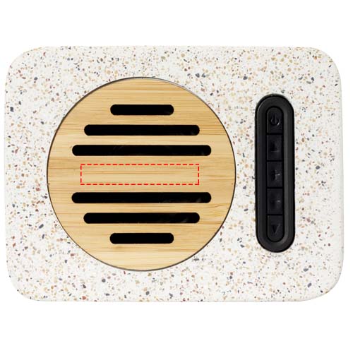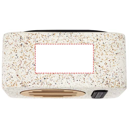 Bluetooth® speaker made of a combination of natural terrazzo and bamboo. Speaker output is 5W and it contains a 500mAh lithium polymer battery. Bluetooth® 5.0 working range up to 10 metres. This speaker allows up to 2 hours playback time at max volume, and it takes approximately 2 hours to charge from 0% to 100%. Delivered in a gift box with an instruction manual (both made of sustainable material).