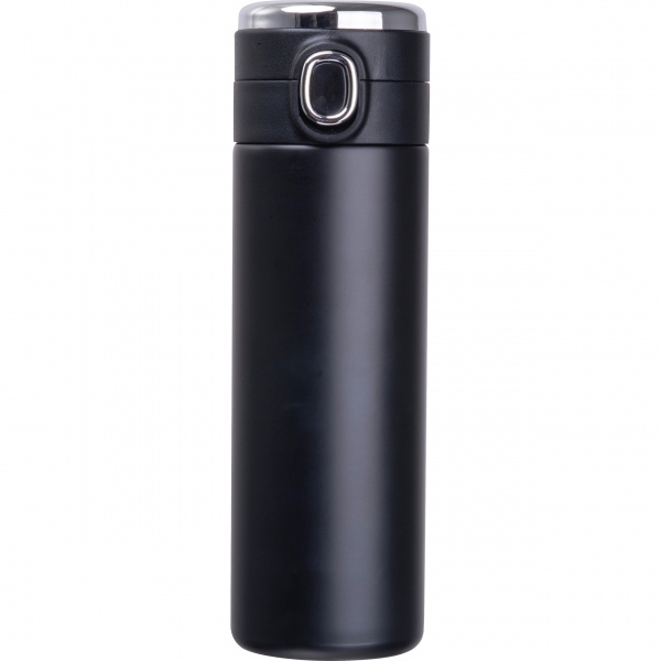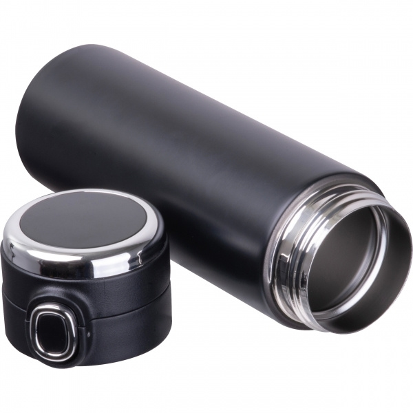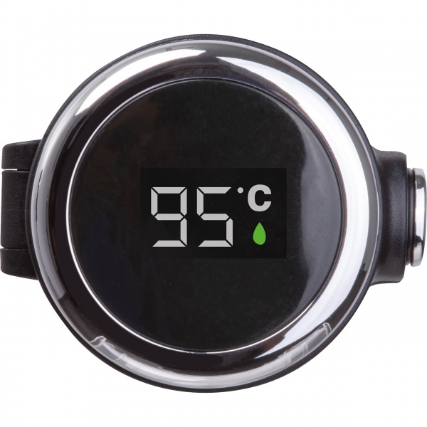 Vacuum insulated stainless steel bottle with temperature display in the lid and safety lock. Maximum temperature display: 99°C. Your logo is applied to the bottle using laser engraving.
