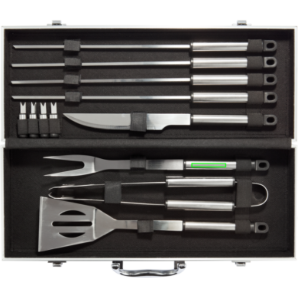 12 tk roostevabast terasest grillikomplekt, sealhulgas 4 tk varrast, nikerdusnuga, 4 maisihoidjat, spaatel, kaitsekattega nikerduskahvel ja tangid. Pakitud hingede ja käepidemega alumiiniumkarpi.