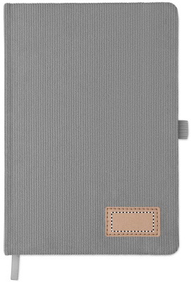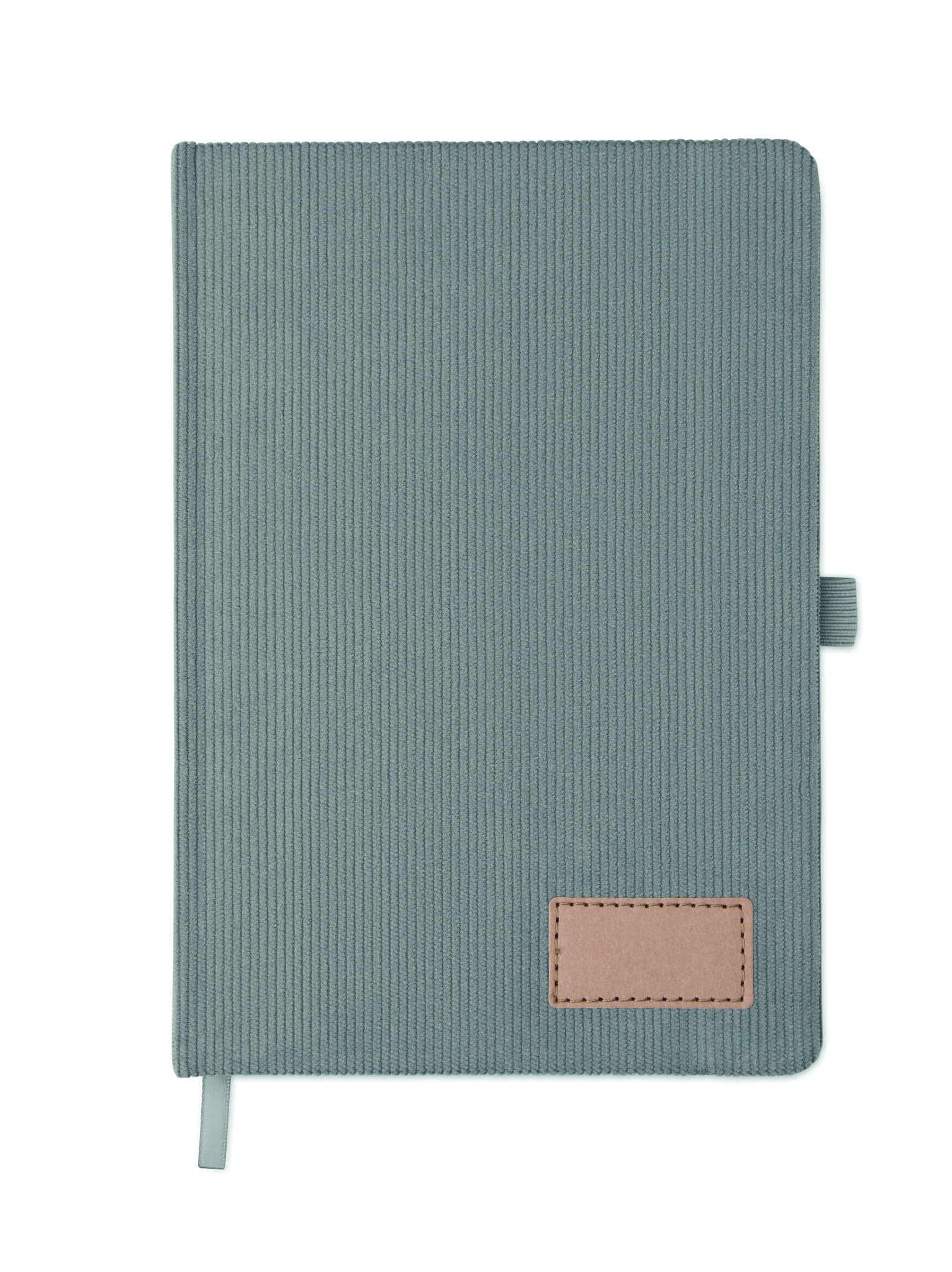 A5 märkmik kõva RPET polüestervelvetist kaane ja 192 vooderdatud taaskasutatud paberist lehega (70 g/m2). Karpkaanega disain elastse paelaga sulguri, pliiatsiaasa, lindiga leheküljemarkeri ja kulunud kraftpaberist sildiga.