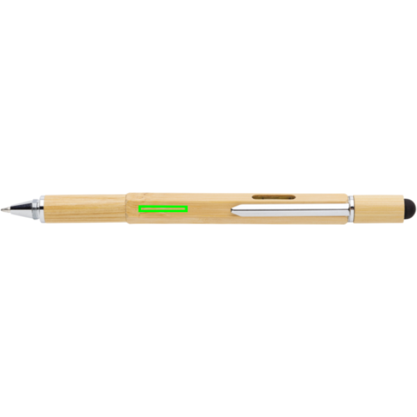 Multifunktsionaalne bambusest pliiats joonlauaga (7cm), vesiloodi, kruvikeeraja, pliiatsi ots ja sinise kirjutustindiga kuulpunkt (kuni 400m) Valmistatud bambusmaterjalist alumiiniumklambriga.