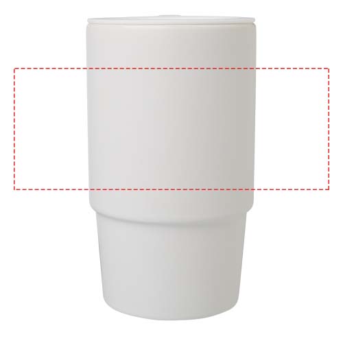 Keraamiline kruus, millel on suur käepide ja pritsmekindel plastikust kaas. Pakendatud taaskasutatud papist kinkekarpi. Mahutavus: 450 ml.