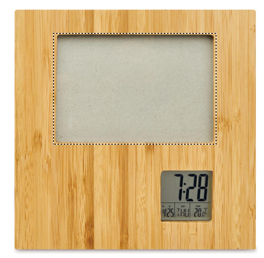 Bambusest pildiraam ilmajaamaga. Näitab kellaaega, kuupäeva ja temperatuuri. Äratusfunktsioon ja taimer. 2 AAA patareid ei kuulu komplekti. Bambus on looduslik toode, ühe eseme värvis ja suuruses võib esineda väikesi erinevusi, mis võivad mõjutada lõppviimistlust.