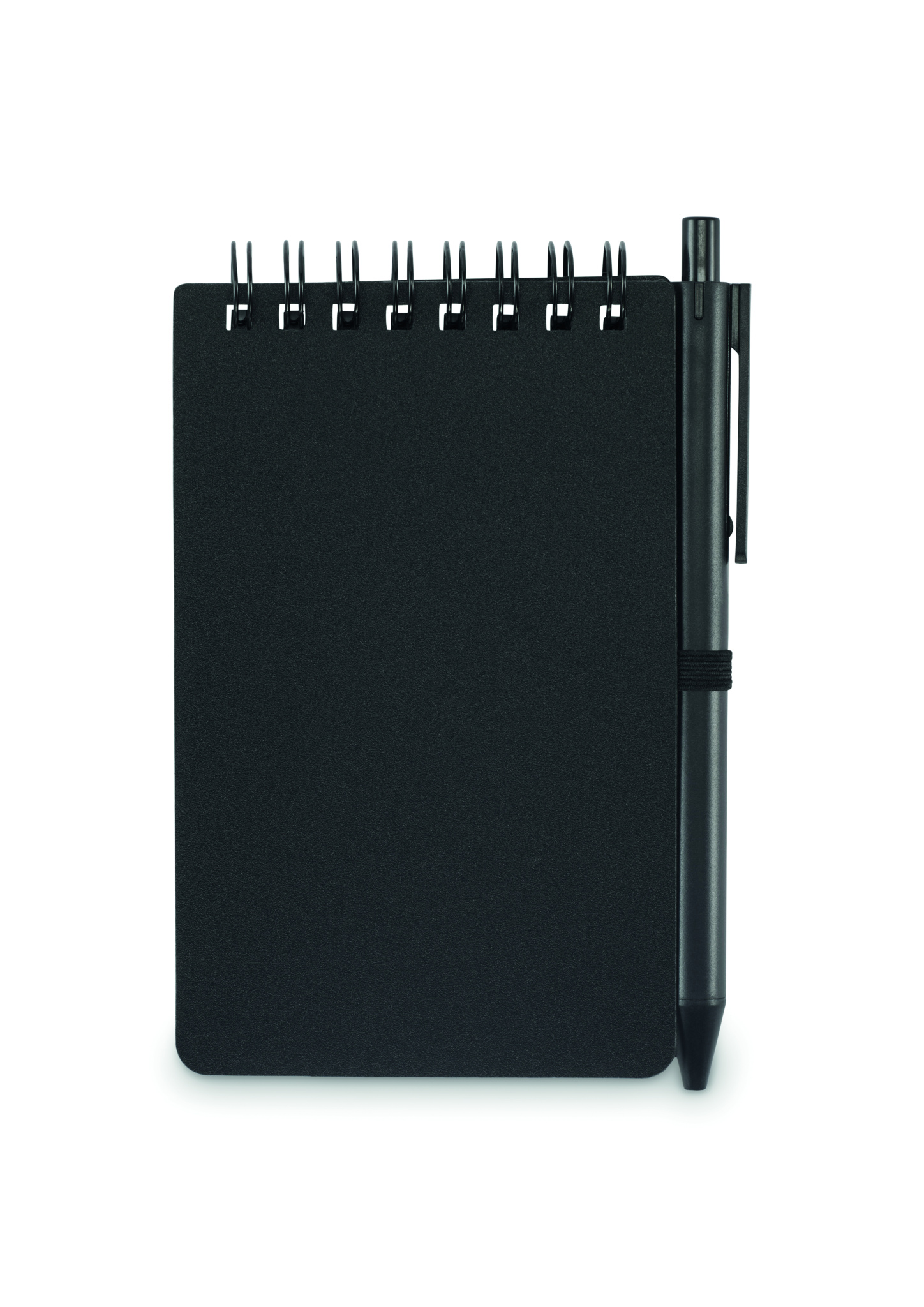 Veekindel märkmik PP-kaane ja pastapliiatsiga. Kahekordne spiraalköide. Mineraalpaber 120 g/m², 50 lehte. Sinine tint. Pastapliiatsi hoidja.