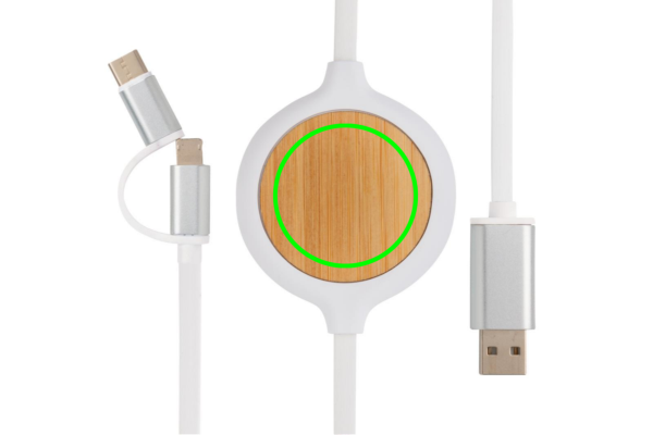 Ainulaadne bambusest disainiga kolm-ühes laadimiskaabel integreeritud 5W juhtmevaba laadijaga. 100 cm kaabel on valmistatud PVC-vabast TPE materjalist. C-tüüpi ja kahepoolse pistikuga IOS- ja Android-seadmetele, mis nõuavad mikro-usb-d. Integreeritud 5 W juhtmevaba laadijaga, et laadida seadet lihtsalt laadimispinnale asetades. Sisend: 5V/2A. 9V/2A. Juhtmeta väljund: 5V1A, 9V/1.1A. Kaabli väljund max 5V/1A.