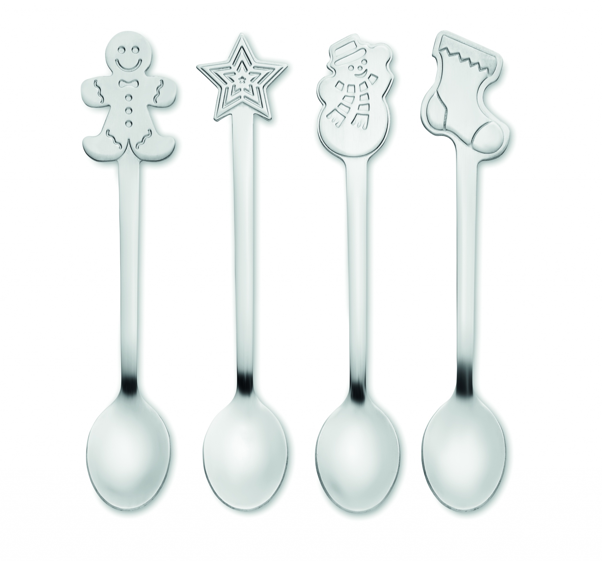 Komplektis 4 erinevat roostevabast terasest jõulumotiiviga teelusikat. Esitatakse kinkekarbis.