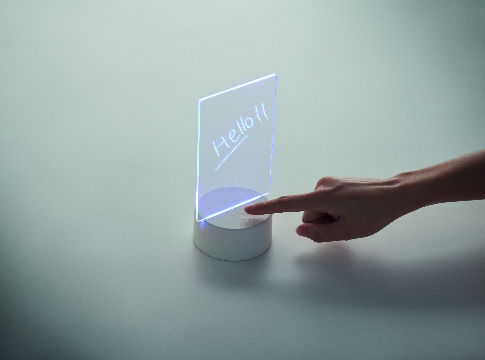 Valgustatud LED-märkmetahvel värvimuutva tule ja kustutatava valge markeriga. Akrüülplaadi ja alumiiniumist alusega. Patareitoitel, vajab 3 x AAA patareid (ei kuulu komplekti).