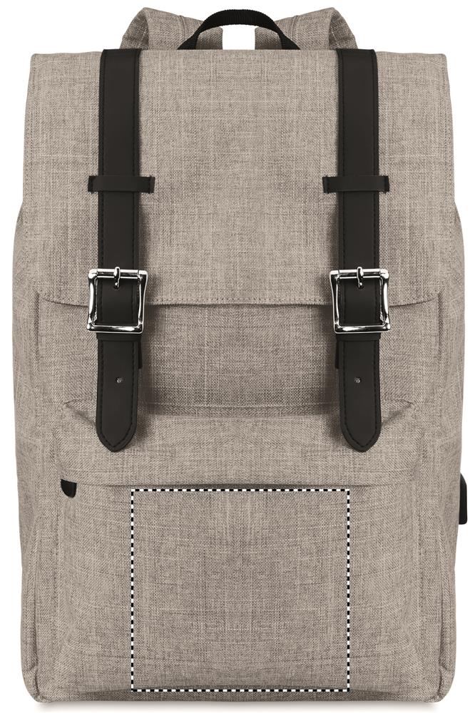 Sülearvuti seljakott 600D 2-toonist polüestrist polsterdatud õlarihmaga, mis sisaldab ühte peamist sisemist sahtlit 15-tollise sülearvuti jaoks ja USB-laadimiskaablit. Kaasas magnetnööbiga kinnis ja üks lukuga esiosa.