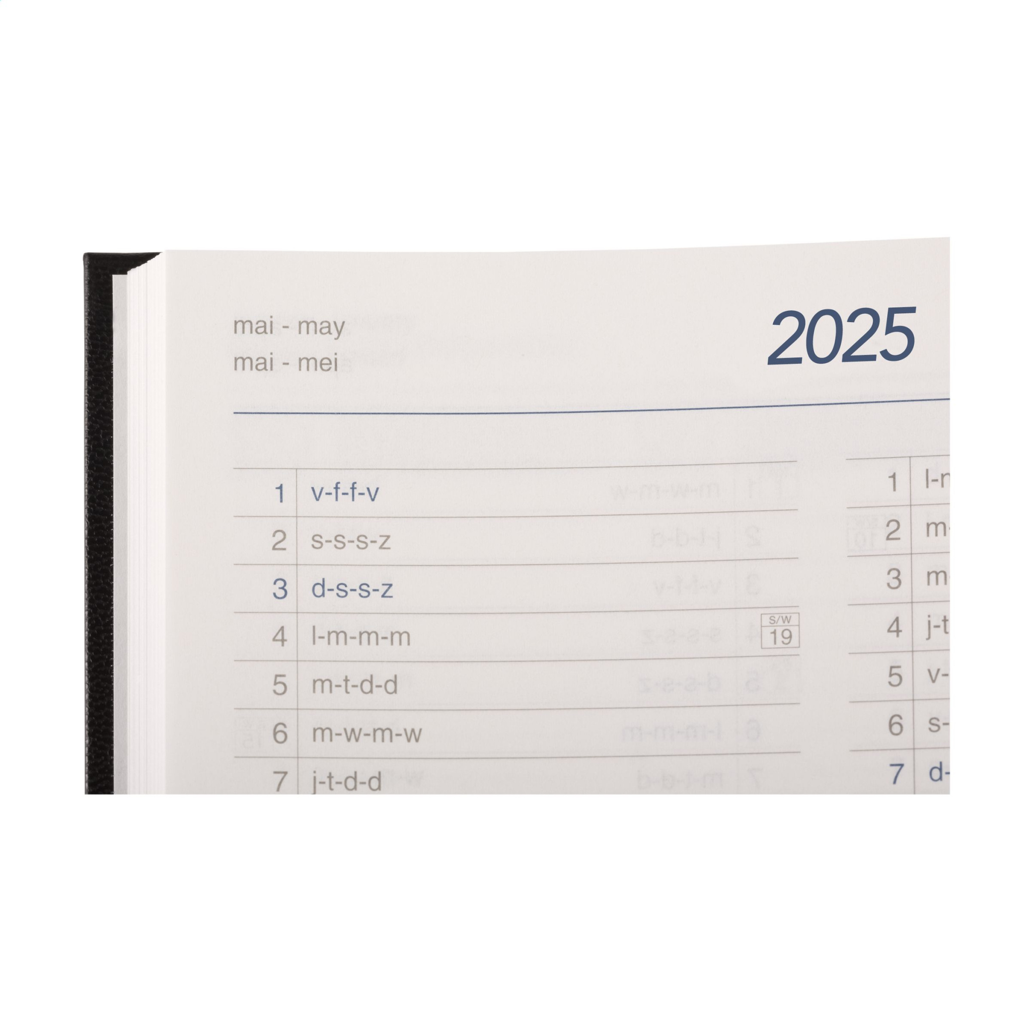 Toimistopäiväkirja neljällä kielellä: EN, NL, F ja D. Kestävä pehmustettu Balacron-kansi ja vuosiluku edessä. 80 g valkoista, FSC Mix -sertifioitua paperia, iso viikkokatsaus kahdelle sivulle, 2-väripainatus, lankasidottu, viikkokatsaus kahdelle sivulle, vuosisuunnittelija kuluva vuosi ja ensi vuosi, lisähyödyllistä tietoa. Lähes A5 kokoa.