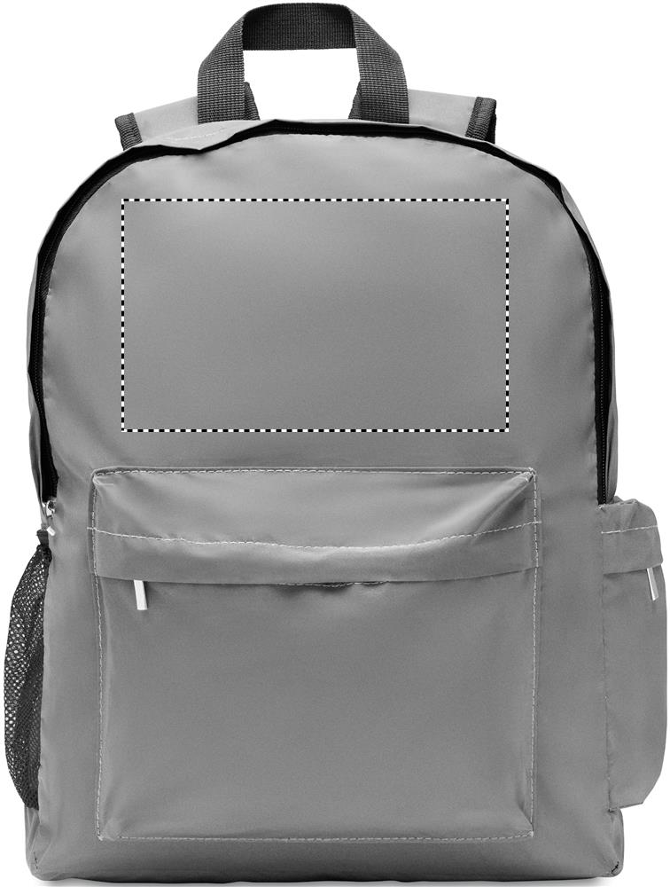 Reppu heijastavaa 190T polyesteriä. Pehmustettu selkäosa, hihnat ja pohja. Repussa on lokero 15'' kannettavalle tietokoneelle. Vetoketjullinen tasku edessä ja verkkotasku sivulla sekä muita vetoketjullisia taskuja sivulla.
