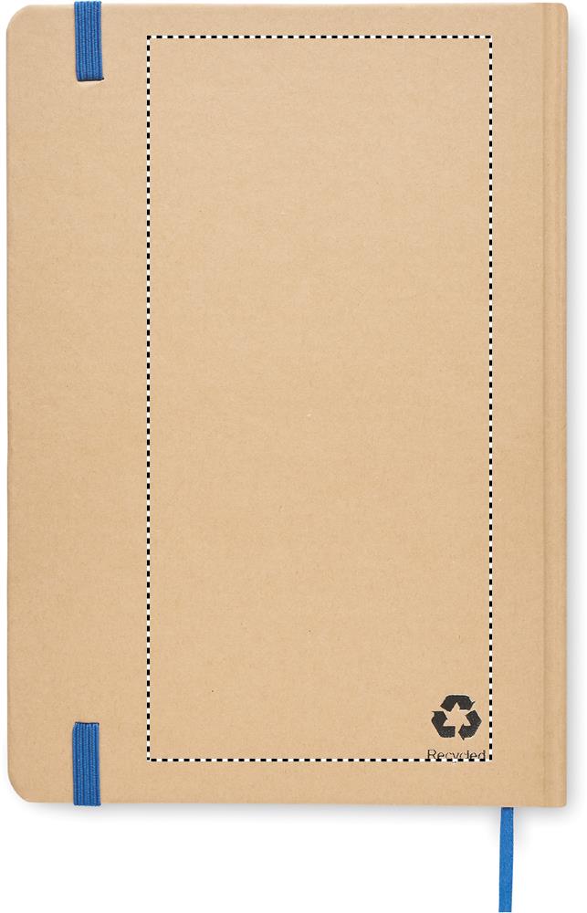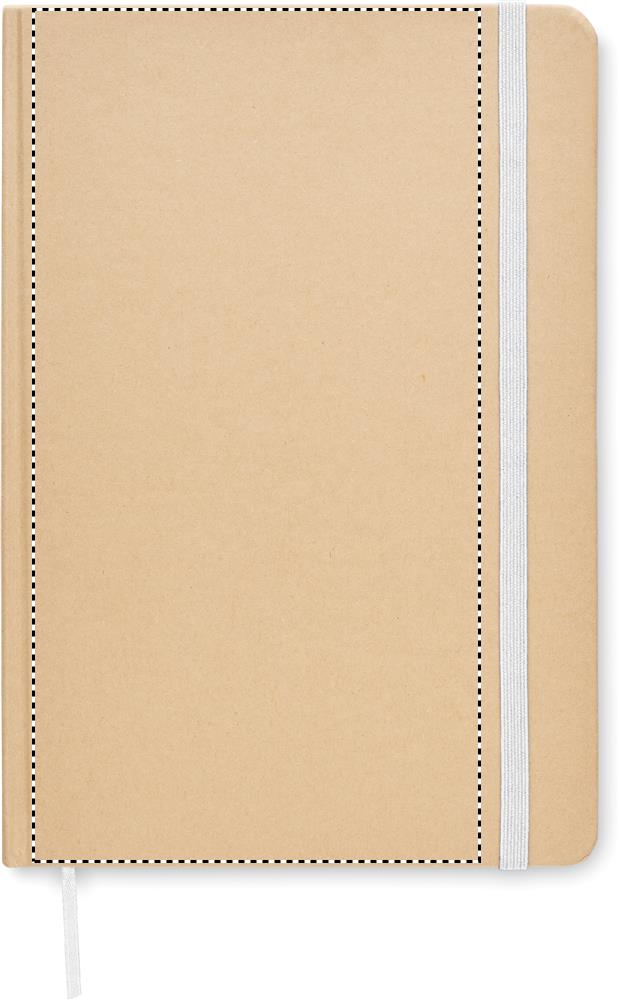 Kierrätyskartongista valmistettu muistikirja A5. Sisäsivut kierrätyspaperia, 160 ruudutettua sivua (80 arkkia). Kiinnitys kuminauhalla ja kirjanmerkki.
