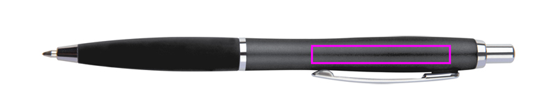 Ohut muovinen kuulakärkikynä, jossa on sinikirjoitus muovitäyttö ja kumitettu otealue. Logosi painetaan klipin alle.
