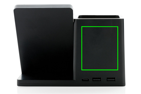 10W langaton pikalaturi kynäpidikkeellä valmistettuna RCS (Recycled Claim Standard) sertifioidusta kierrätetystä ABS:stä. Kierrätetyn materiaalin kokonaismäärä: 78% perustuen tuotteen kokonaispainoon. RCS sertifiointi varmistaa kierrätettyjen materiaalien täysin sertifioidun toimitusketjun. Langaton latausalue valmistettu FSC 100 bambusta. Takaosassa kaksi USB porttia langallista latausta varten. Langaton lataus yhteensopiva Androidin uusimpien sukupolvien sekä iPhone 8 ja uudempien kanssa. Tuote ja lisätarvikkeet PVC-vapaita. Sisältää 120 cm tyypin C latauskaapelin valmistettuna RCS sertifioidusta kierrätetystä TPE:stä. Pakattu FSC-sekoituksesta valmistettuun kraft pakkaukseen. Tyypin C tulovirta 5V/2A; 9V/2A; langaton lähtövirta 5V/1A;9V/1.1A; (10W). Rekisteröity design®