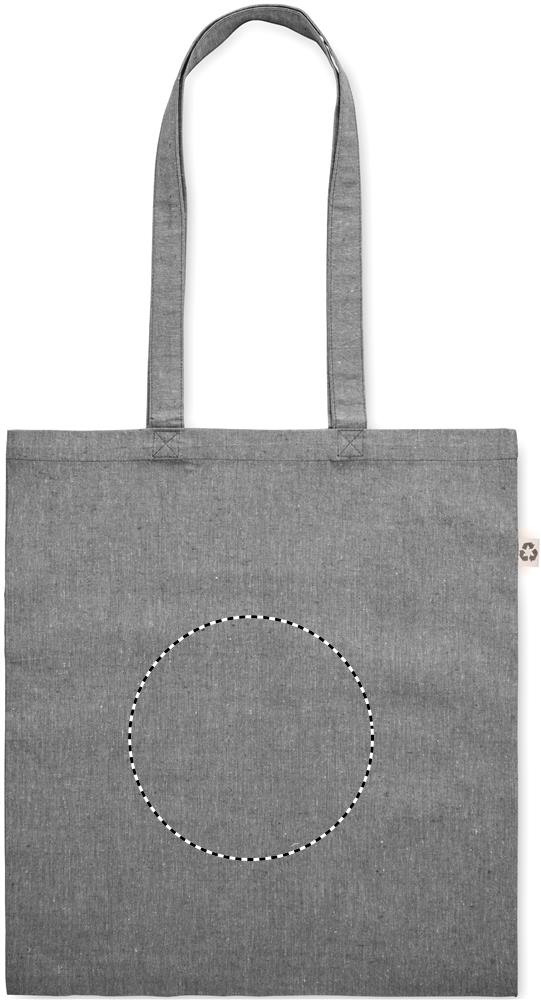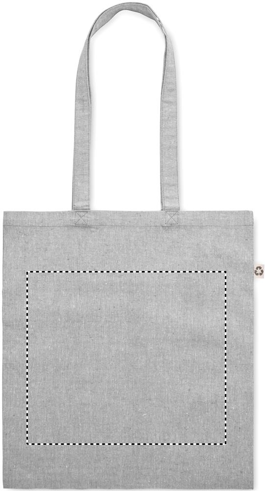 Kierrätyspuuvillasta valmistettu ostoskassi jossa pitkät kahvat. Materiaali 80 % kierrätyspuuvillaa/20 % puuvillaa, 140 gr/m².