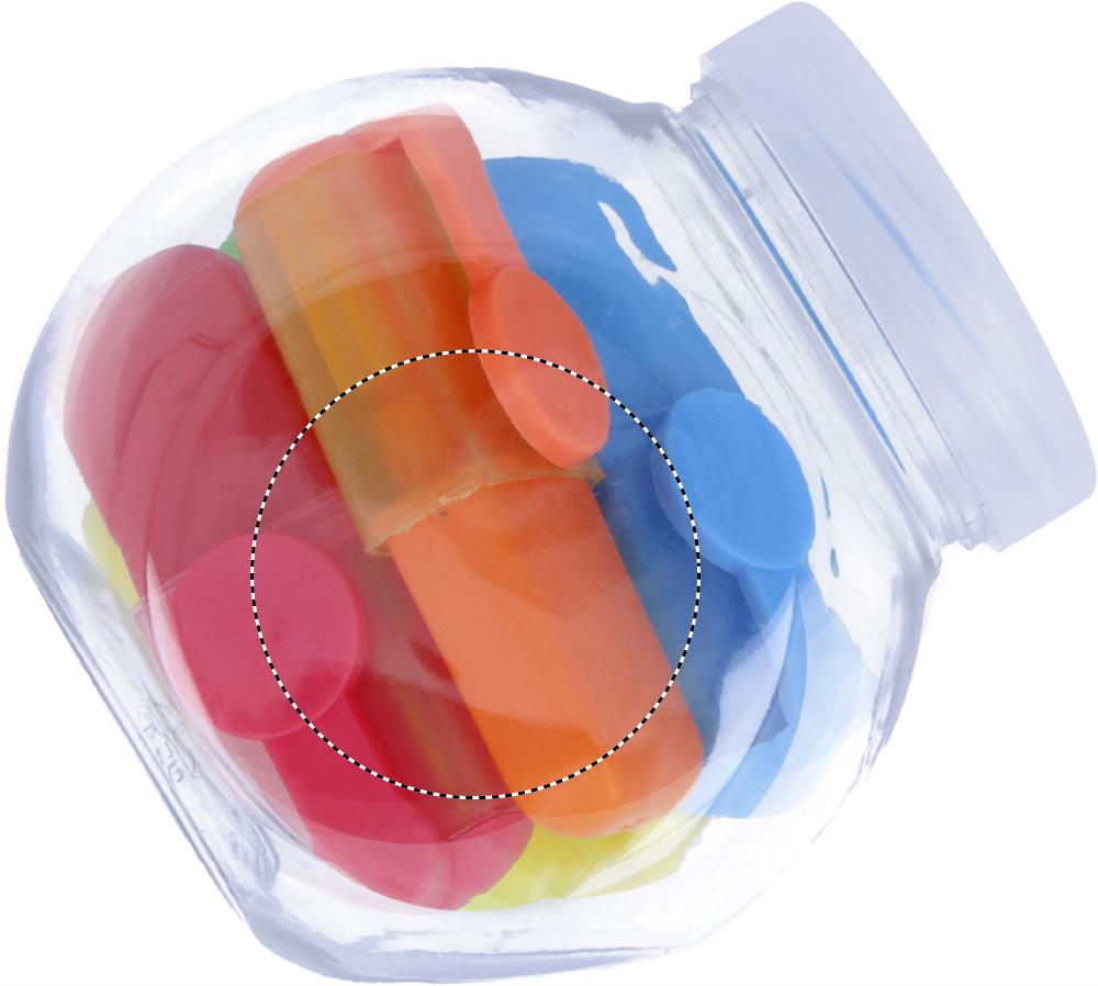 Viisi yliviivaustussia klipsillä, läpinäkyvässä PET-purkissa.