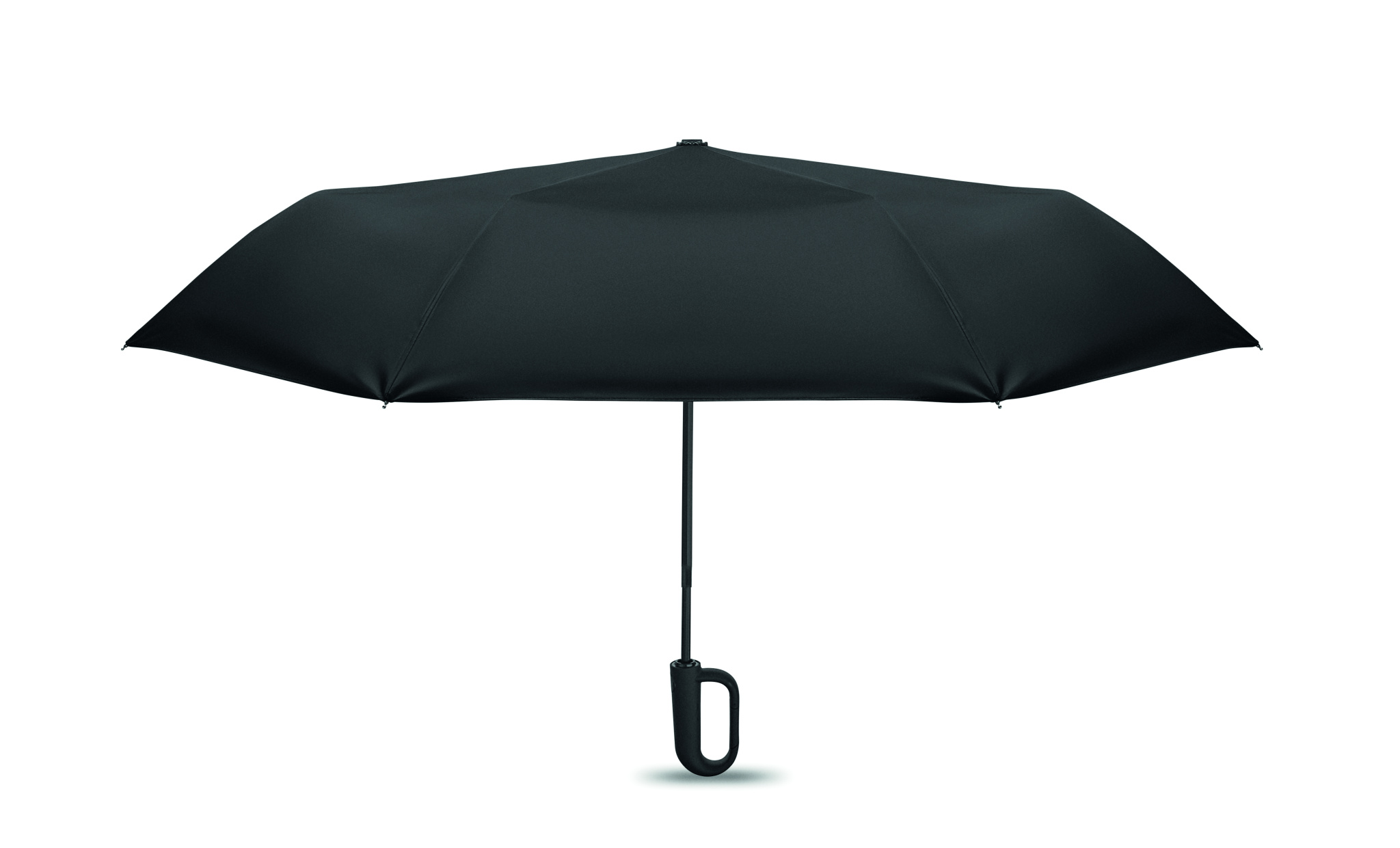 Sulankstomas 21 colio vėjui atsparus skėtis su visiškai juodai dengtu stiklo pluošto rėmu su 2 dalimis. Stiklo pluošto šonkauliai. 190T RPET pongee plokštės. D formos karabino rankena su gumine apdaila. Automatinis atidarymas ir uždarymas. Pridedamas maišelis.