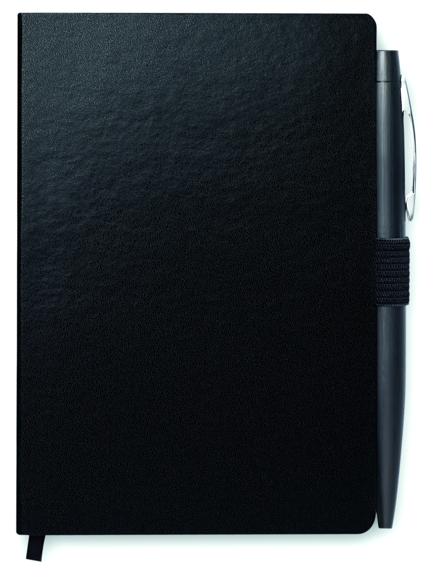 A6 užrašų knygelė su rašikliu. Kietas PU dangtelis. Byla. 144 linijuoti puslapiai (72 lapai). Tinkamas elastingas užsegimo dirželis, kaspininė žymė ir rašiklio laikiklis. Tinkantis metalinis rutulinis rašiklis. Mėlynas rašalas.