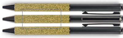 Metalinis rutulinis rašiklis su audiniu ant korpuso, pagamintas iš 20% arbatos tirščių, 30% kamštinės medžiagos, 50% polimedvilnės audinio, kartoninėje dėžutėje. Mėlynas rašalas.
