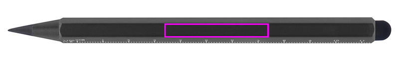 Aliuminio rašiklis be rašalo su jutikline funkcija ir masteliu cm ir coliais. Švinas yra pagamintas iš grafito ir metalo mišinio, todėl jis yra ypač patvarus. Jūsų logotipas bus išgraviruotas ant laisvos vietos ant statinės.