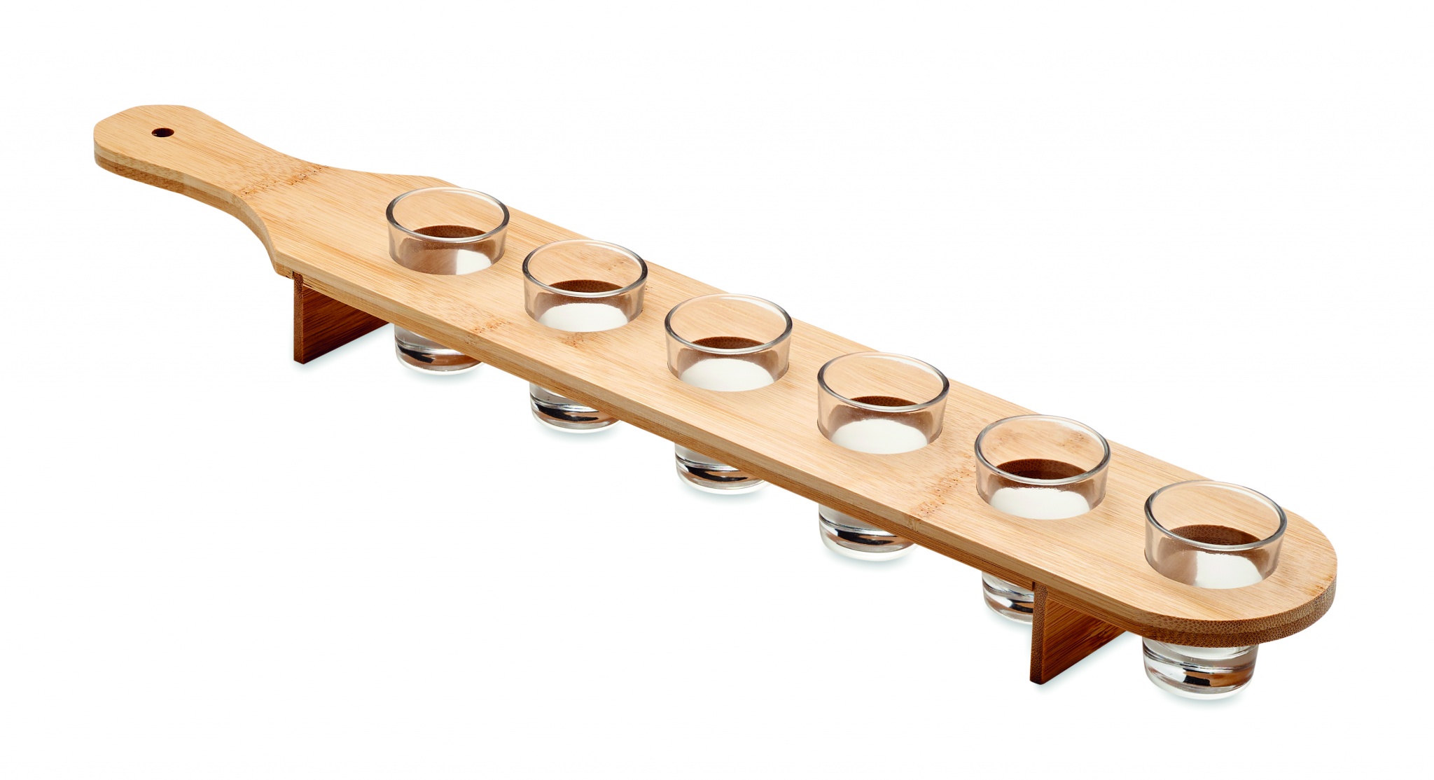 Komplektā 6 glāzes uz bambusa lāpstiņas paplātes. Tilpums: 20 ml. Bambuss ir dabisks produkts, katrai precei var būt nelielas krāsas un izmēra atšķirības, kas var ietekmēt gala apdares rezultātu.