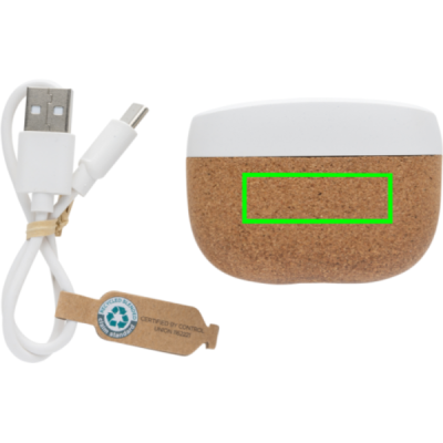 Eleganta dizaina bezvadu austiņas, kas izgatavotas no FSC® 100% korķa un RCS (Recycled Claim Standard) sertificēta pārstrādāta ABS. Kopējais pārstrādātais saturs: 35% no kopējā preces svara. RCS sertifikācija nodrošina pilnībā sertificētu pārstrādāto materiālu piegādes ķēdi. Ideāli pieguļošajām austiņām ir 35 mAh akumulators, un tās var atkārtoti uzlādēt 300 mAh uzlādes futrālī 1,5 stundu laikā. Ar automātiskās savienošanas pārī funkciju, kas ir tik vienkārši savienojama pārī ar mobilo ierīci. Atskaņošanas laiks vidējā skaļumā apmēram 3 stundas. Ar BT 5.3 optimālam savienojumam. Darbības attālums līdz 10 metriem. Ar pacēlāju un mikrofonu. Ietver 3 izmēru silikona ausu uzgaļus. Ietver RCS sertificētu pārstrādātu TPE uzlādes kabeli. Iepakots FSC® mix kraft iepakojumā. Prece un aksesuāri 100% bez PVC.