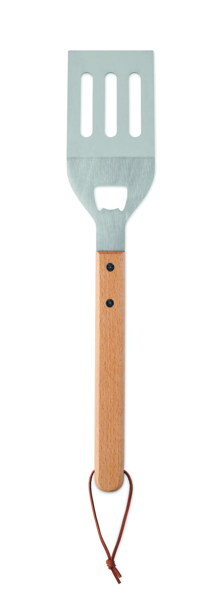 Stainless steel BBQ spatula with beechwood handle and integrated bottle opener. Includes PU rope hanger for easy storage.