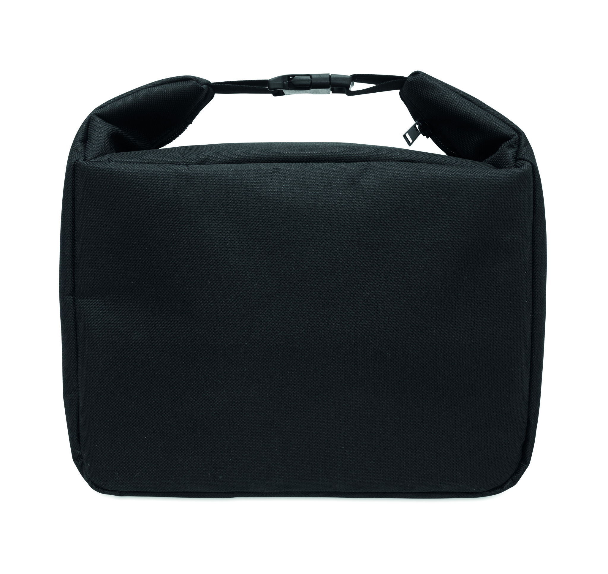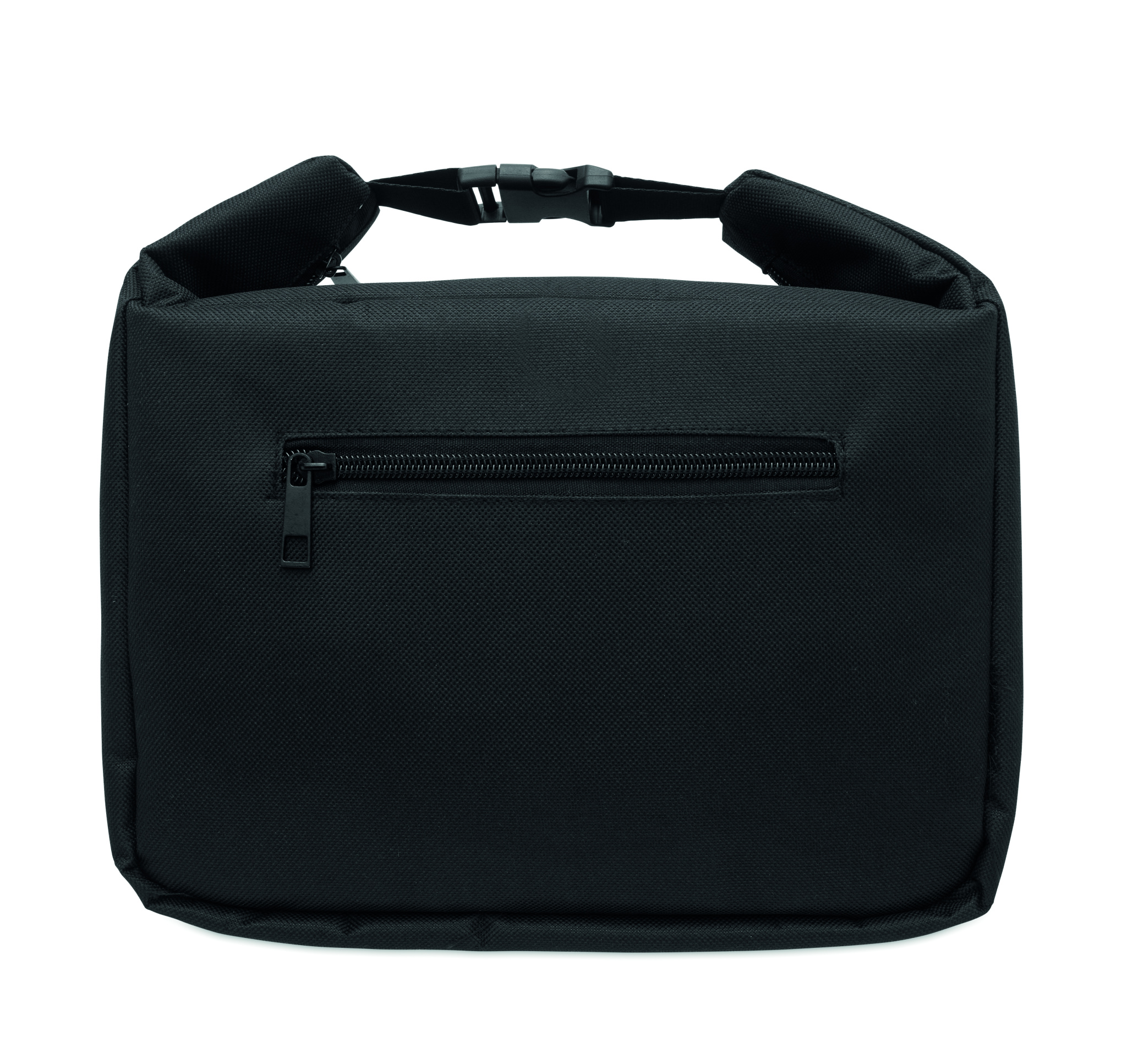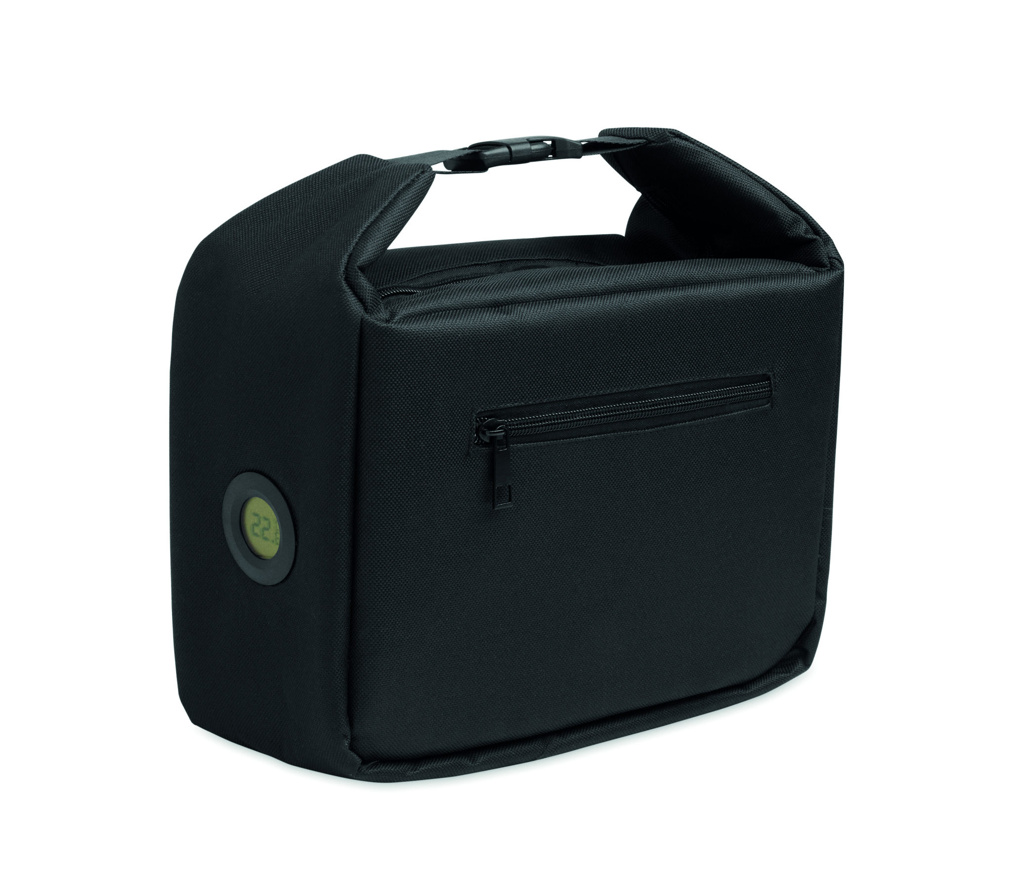 Cooler lunch bag with internal temperature indicator made of 600D RPET with 3mm PE foam with aluminium foil lining. Buckle closure. Zippered main compartment. With side zippered pocket. Capacity: 10L