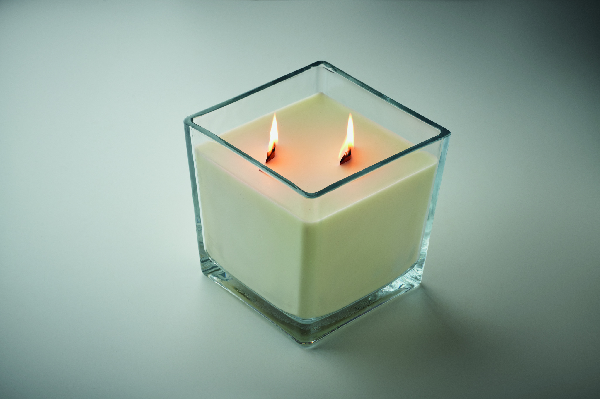 Extra large vanilla fragranced plant based wax candle 1300gr in glass with 2 wooden wicks and beehive design on top. Burning time 70 hours