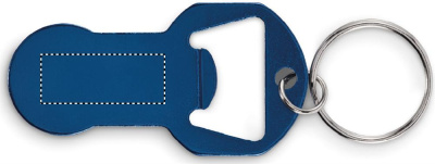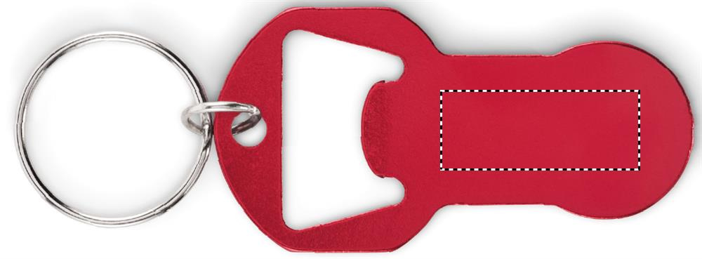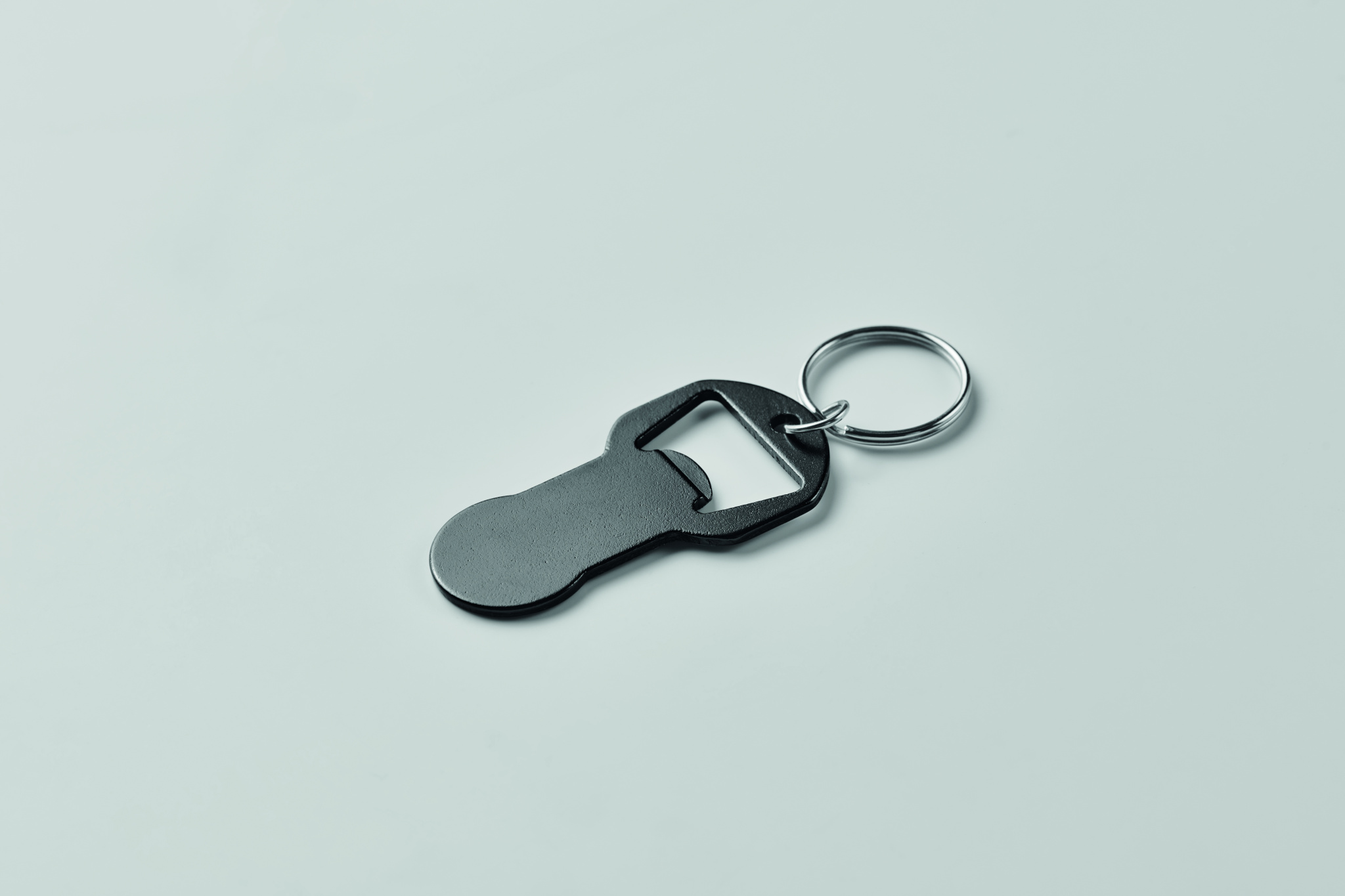 Bottle opener token keyring made of recycled aluminium with iron ring.