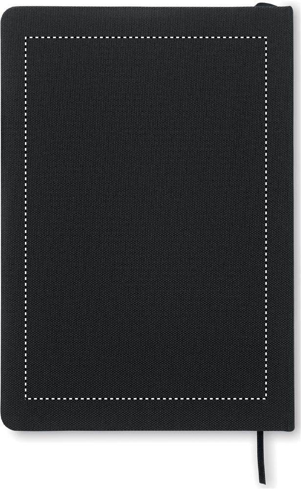 A5 anteckningsblock med hårt omslag i 600D RPET. Pärm med telefonhållare och elastiskt band på framsidan samt pennögla. inklusive aluminiumpenna med bambudetalj (blått bläck). Inbunden med 160 linjerade sidor av återvunnet papper (80 ark) med sidomarkör. Ficka på insidan pärm bak.