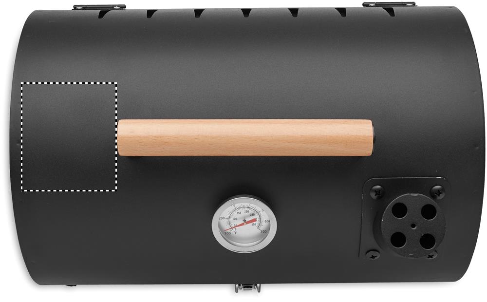 Bärbar grilltunna i järn med skorsten och temperaturmätare. Svart pulverlackerad eldstad. Låsspärr och bärhandtag i trä.