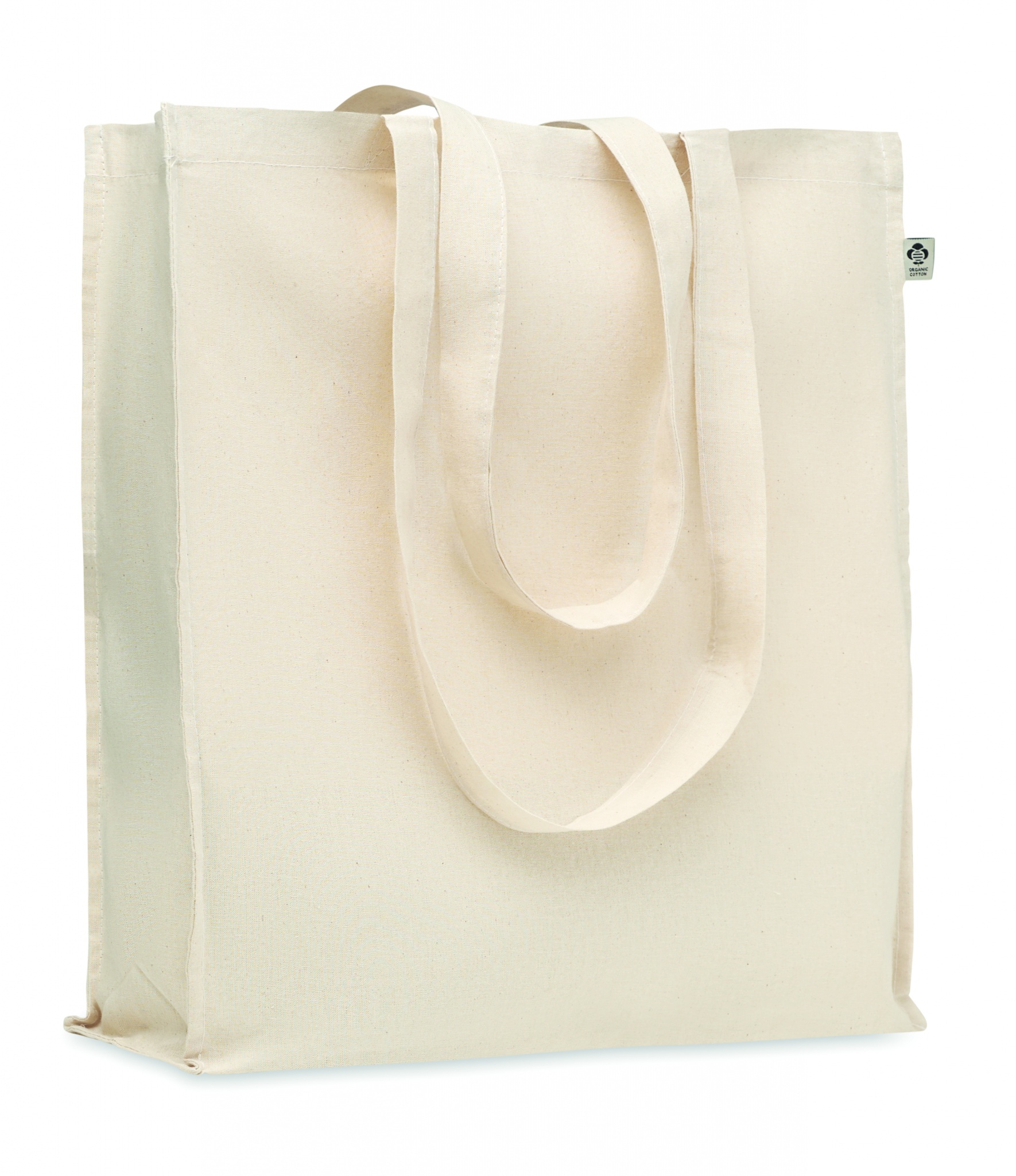 Kasse i ekologisk bomull medbälg och långa handtag. 140 gr/m².