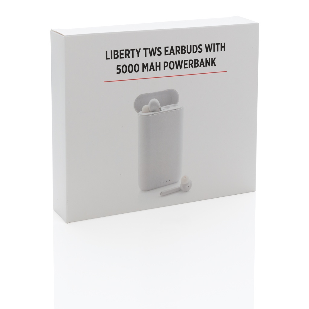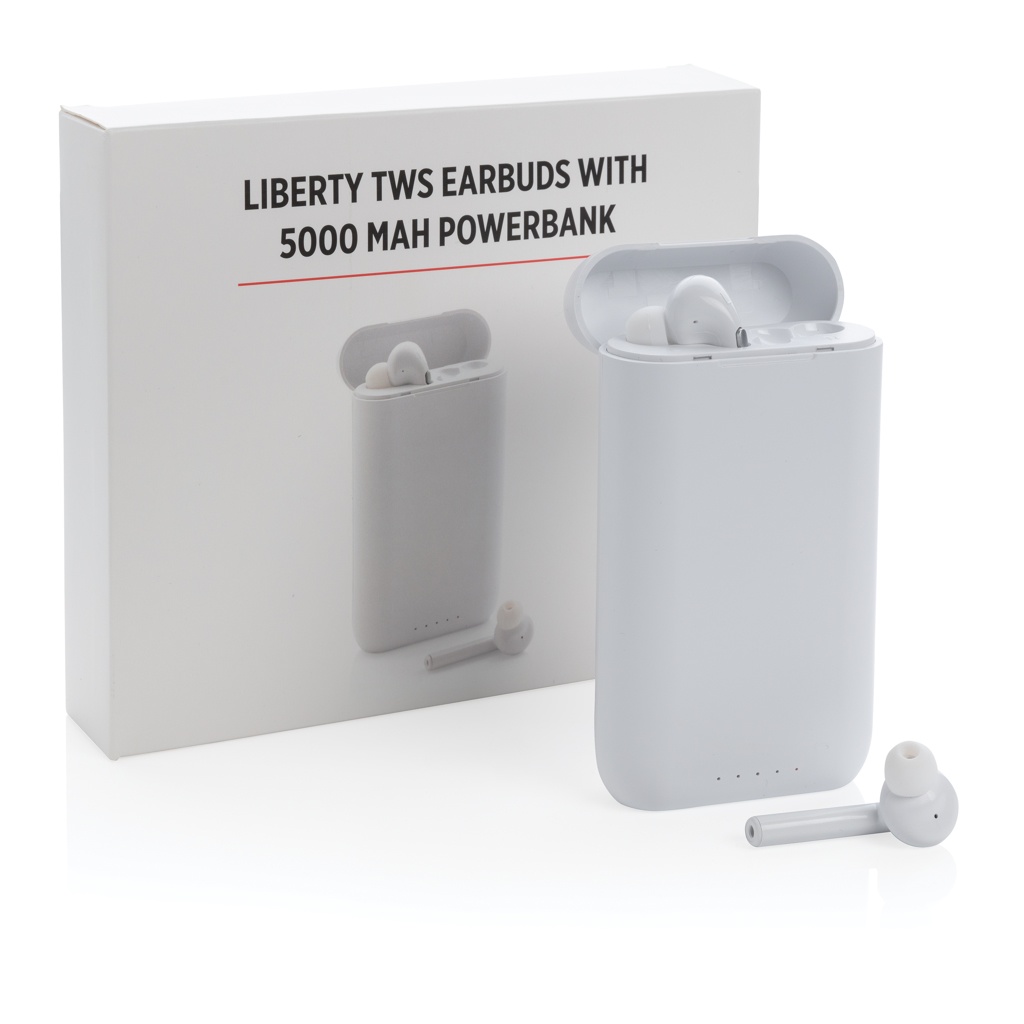 Logotrade kampanjprodukter bild: Liberty TWS öronsnäckor med 5.000 mAh powerbank