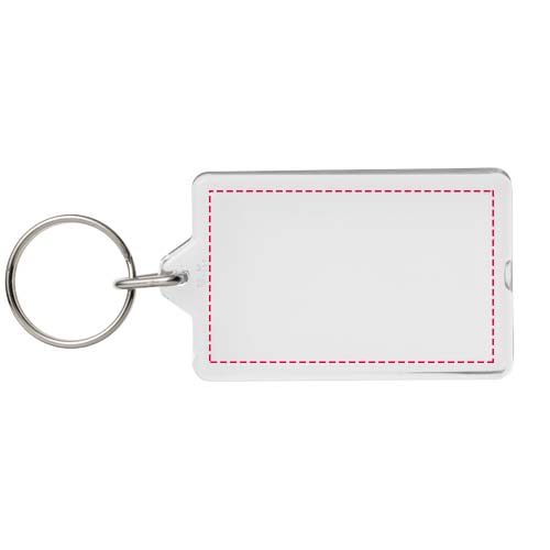 Luken återöppningsbar nyckelring G1. Genomskinlig rektangulär nyckelring G1 med delad metallring. Denna nyckelring kan öppnas med ett mynt. Metallringen har en platt profil som är idealisk för utskick. Tryckinläggets dimensioner: 5,0 cm x 3,0 cm. GPPS-plast.