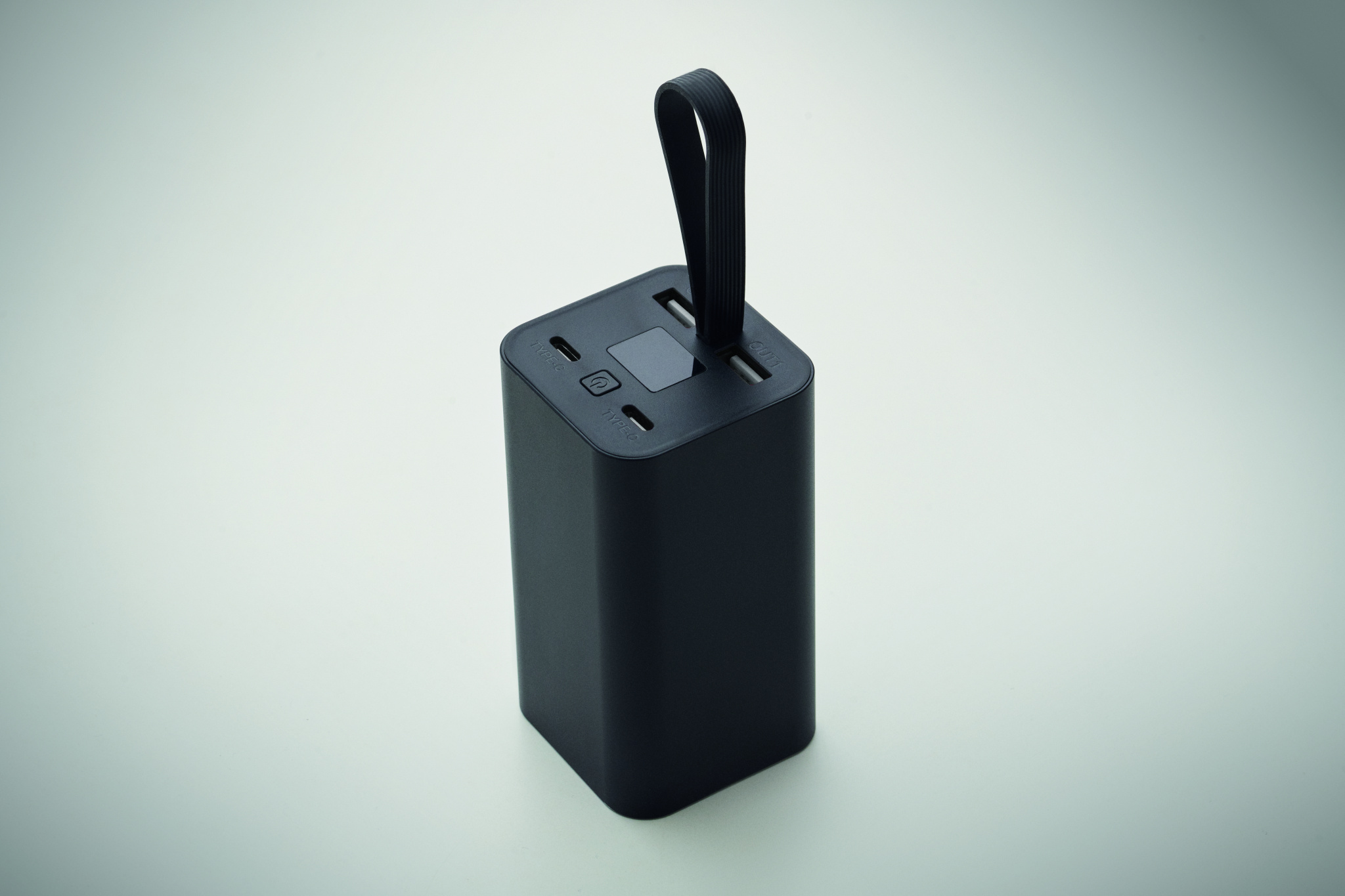 Kraftig 20.000 mAh powerbank tillverkad av återvunnen aluminium med digital effektdisplay och silikonhängare. Har två Type-C- och två USB-A-utgångar med PD 65W snabbladdning. Laddar surfplatta/Laptop